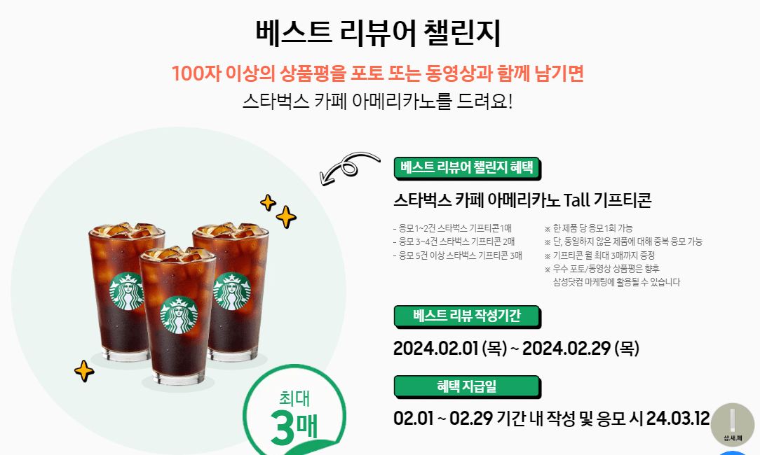 이벤트 기간 동안 갤럭시 제품에 대한 상품평을 작성하고 포토 또는 동영상과 함께 응모하면, 스타벅스 카페 아메리카노 Tall 기프티콘을 받을 수 있습니다. 또한, SNS에 후기를 남기면 추가 혜택이 주어집니다.