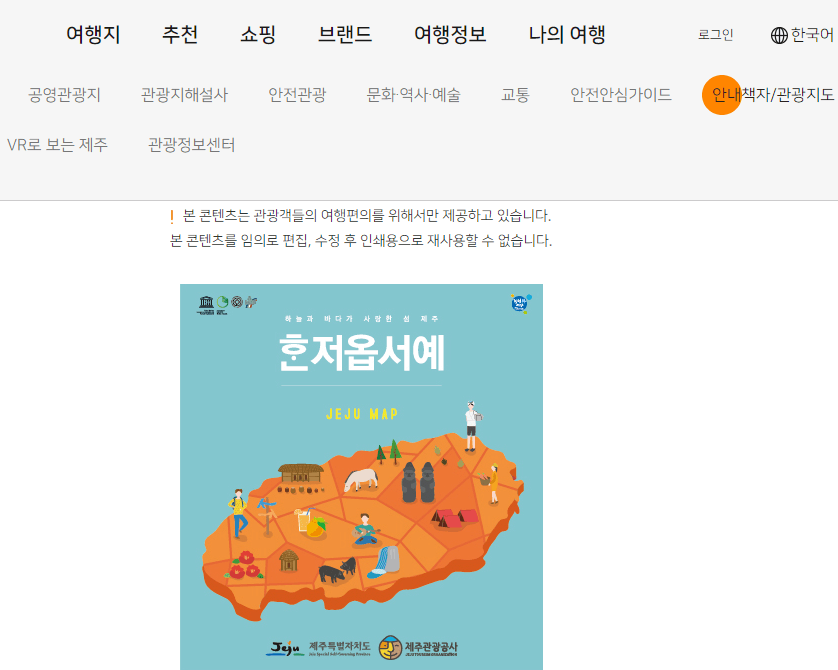 제주관광정보센터 비짓제주 웹사이트는 여행정보 메뉴에서 안내책자/ 관광지도 탭에서 해당 내용을 확인하실 수 있습니다.