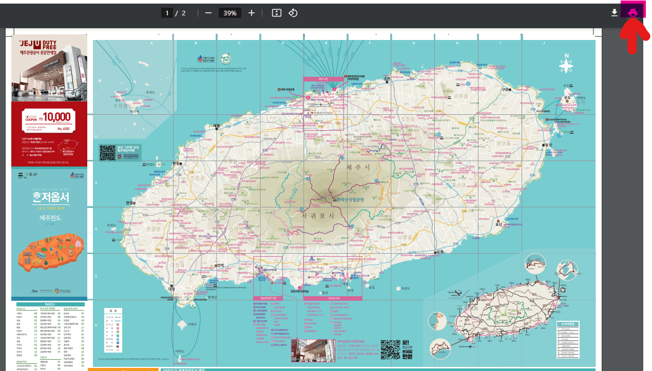 비짓제주 웹 브라우저에서 여행정보 - 안내책자 관광지도 탭으로 들어가면 제주관광지도를 보실 수 있으며 PDF 문서를 바로 보거나 다운로드 하실 수 있습니다. 또한 인쇄 기능을 사용하거나 해당 웹사이트에서 제공하는 인쇄 버튼을 클릭합니다.