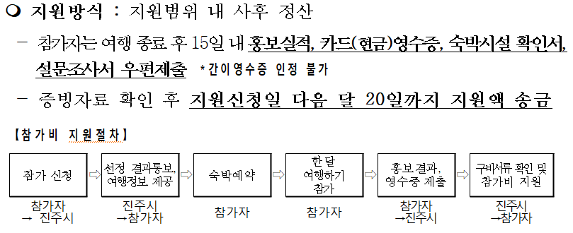 - 참가 신청 → 선정 결과 통보 및 여행 정보 제공 → 숙박 예약 → 여행 참가 → 홍보 결과 및 영수증 제출 → 구비 서류 확인 및 참가비 지원