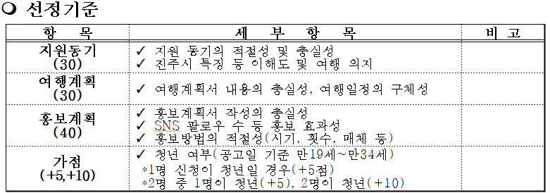 선정기준은 참가자의 지원 동기와 진주시에 대한 이해도, 여행 계획의 구체성과 충실성, 홍보 계획의 효과성 및 적절성을 평가합니다.
